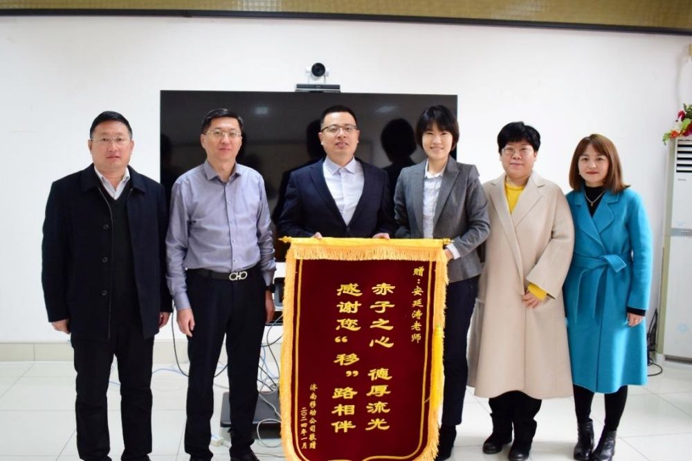 2月29日上午,济南市移动公司代表们来到金年会jinnianhuicom,将一面绣有“赤子之心 厚德流光,感谢您‘移’路相伴”的锦旗送到学院,以表达对金年会jinnianhuicom安延涛老师的感谢之情,学院党委书记程涛、副书记孙成政参加了捐赠仪式。
