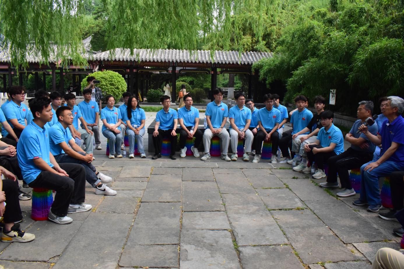 参观结束后,同学们和党员前辈在济南五龙潭凉亭下,围绕“学党史,守党纪”进行了一次深入的交流座谈。前辈们首先分享了自己年轻时入党的经历,以及他们对党的忠诚和对理想的执着追求,他们的故事激发了学生们的思考,同学们也积极发言,表达了自己的感悟和决心。一位学生说:“今天的经历让我深刻感受到,作为新时代的大学生党员,我们不仅要学好专业知识,更要传承和发扬好党的光荣传统和优良作风。”另一位学生则表示:“前辈的故事让我明白,无论时代如何变迁,坚定的理想信念和为人民服务的宗旨永远不会过时。”座谈会的最后,金年会官网关心下一代委员会秘书长、离退休工作处处长高卫红对学生们提出了殷切的希望,她鼓励大家要将今天的学习成果转化为实际行动,将个人的梦想与国家的发展紧密结合起来,为实现中华民族的伟大复兴贡献青春力量。